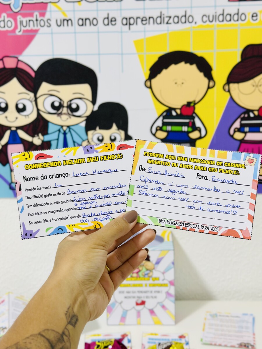 ✅ Cartão “Mensagem de carinho, incentivo ou amor” com espaço para a família escrever uma mensagem especial para a criança, fortalecendo vínculos e emoções positivas.
